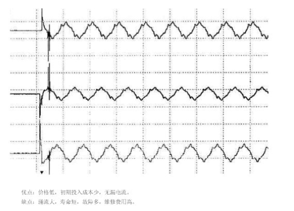 接触器投切过程中,电容器的初始电压为零,触点闭合瞬间,绝大多数情况下电网电压不为零、有事可能处在高峰值,(极少为零),因而产生非常的电流,也就是常说的合闸涌流。实验表明合闸涌流严重时可达电容器额定电流的50倍。这不仅影响电容器和接触器的使用寿命,而且对电网造成冲击,影响其它设备的正常工作。因此,后来采用加入限流电阻来控制合闸涌流即:电容投切专用接触器。这虽然可以控制涌流在额定电流的20倍以内,但从长期运行情况来看,其事故率仍然很高,维护费用较高。其原因间图1,投入波形图见图2。总的实验反应,其性能是: