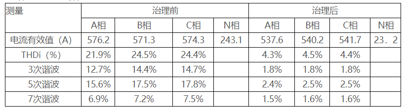 通过在现场对负荷进行测试,进行谐波治理前后A、B、C三相电电流测量结果整体情况汇总如下所示: